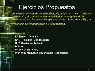 El documento presenta tres ejercicios de circuitos eléctricos resonantes. El primero calcula los valores de capacitancia y factor de calidad de un circuito RLC en serie. El segundo determina los parámetros de un circuito resonante en paralelo dado su frecuencia de resonancia, ancho de banda e impedancia. El tercero calcula varios parámetros como la frecuencia de resonancia, frecuencias de media potencia, factor de calidad y ancho de banda para un circuito RLC en paralelo con valores dados.
