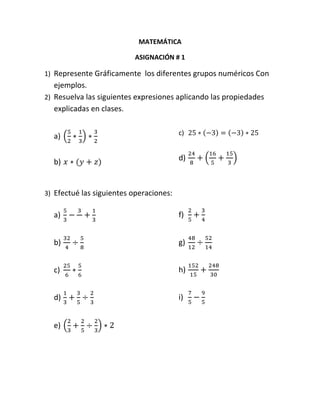 El documento presenta una asignación de matemáticas con cuatro secciones. La primera sección pide representar gráficamente diferentes grupos numéricos con ejemplos. La segunda sección incluye resolver expresiones aplicando propiedades matemáticas. La tercera sección contiene efectuar varias operaciones matemáticas. La cuarta sección pide identificar a qué conjunto pertenecen diferentes expresiones numéricas.