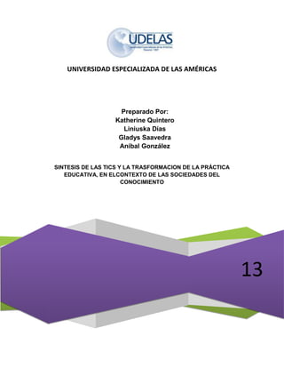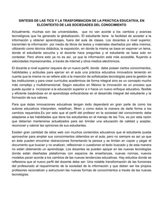 El documento discute el rol cambiante de los profesores en el contexto de las sociedades del conocimiento y el uso creciente de las tecnologías de la información y la comunicación (TIC) en la educación. Señala que los profesores deben actualizar sus conocimientos y habilidades en TIC para apoyar mejor el aprendizaje de los estudiantes. También destaca que las TIC son una herramienta útil pero no deben reemplazar el papel fundamental del profesor en el proceso de enseñanza-aprendizaje.