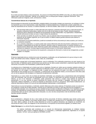 El documento define e introduce los conceptos de hipertexto, hipermedia y multimedia. Explica que un hipertexto es un texto no lineal con enlaces entre páginas, hipermedia combina hipertexto con otros medios como imágenes y video, y multimedia integra diferentes tipos de medios como texto, imágenes, audio y video.