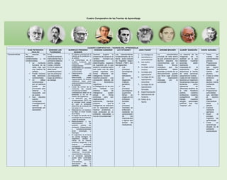 1) El documento presenta un cuadro comparativo de diferentes teorías de aprendizaje como las de Pavlov, Thorndike, Skinner, Gardner, Vygotsky, Piaget, Bruner, Bandura y Ausubel. 2) Cada teoría incluye sus características principales como los conceptos de condicionamiento, refuerzo, inteligencias múltiples, zona de desarrollo próximo, etapas cognitivas, aprendizaje significativo, y aprendizaje observacional. 3) El documento provee una visión general de las principales ideas de