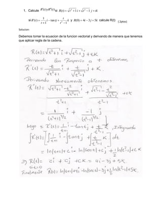Este documento contiene cuatro problemas de cálculo vectorial y multivariable. El primero pide graficar vectores de un campo vectorial. El segundo calcula la derivada de una función vectorial. El tercero calcula el rotacional y divergencia de un campo vectorial. El cuarto y quinto piden obtener ecuaciones de un plano tangente y una recta normal.