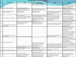 El documento presenta una comparación entre cuatro empresas (CW, Nintendo, COPA, GUPC) en términos de su actividad principal, tipo de organización, tecnologías utilizadas, procesos impactados por la tecnología, organización de servicios tecnológicos y planes estratégicos. Resalta que mientras CW y Nintendo tienen estructuras organizacionales marcadas, COPA es funcional y GUPC es una organización compuesta. También describe los sistemas y tecnologías clave de cada empresa y cómo impactan sus procesos.