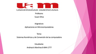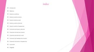Este documento discute los sistemas numéricos utilizados en computadoras, incluidos los sistemas binario, octal, decimal y hexadecimal. Explica cómo cada sistema tiene una base diferente de dígitos y cómo representar y convertir números entre sistemas, como convertir un número binario a decimal multiplicando cada bit por una potencia de 2.