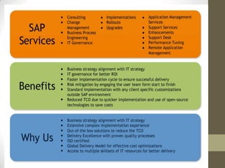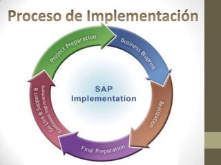 SAP es un sistema de información integrado que comprende múltiples módulos diseñados para trabajar conjuntamente en áreas como finanzas, contabilidad, recursos humanos, logística y ventas. SAP ofrece mayor productividad, eficiencia y capacidad de respuesta al integrar los procesos de negocio y proporcionar acceso a información en tiempo real. La implementación de SAP requiere una inversión significativa y el apoyo continuo de consultores debido a su alcance y complejidad.
