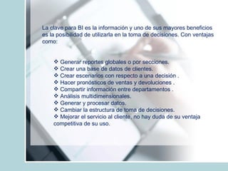 Este documento discute los criterios para diseñar un almacén de datos empresarial y la importancia de la inteligencia de negocios (BI) para apoyar la toma de decisiones mediante el análisis de información. Explica que la BI permite generar informes, pronósticos y escenarios para comprender el comportamiento de los clientes y responder rápidamente a los cambios en el mercado. También destaca la necesidad de integrar y presentar información diversa para satisfacer las necesidades de todos los niveles de la empresa y tomar decisiones basadas en