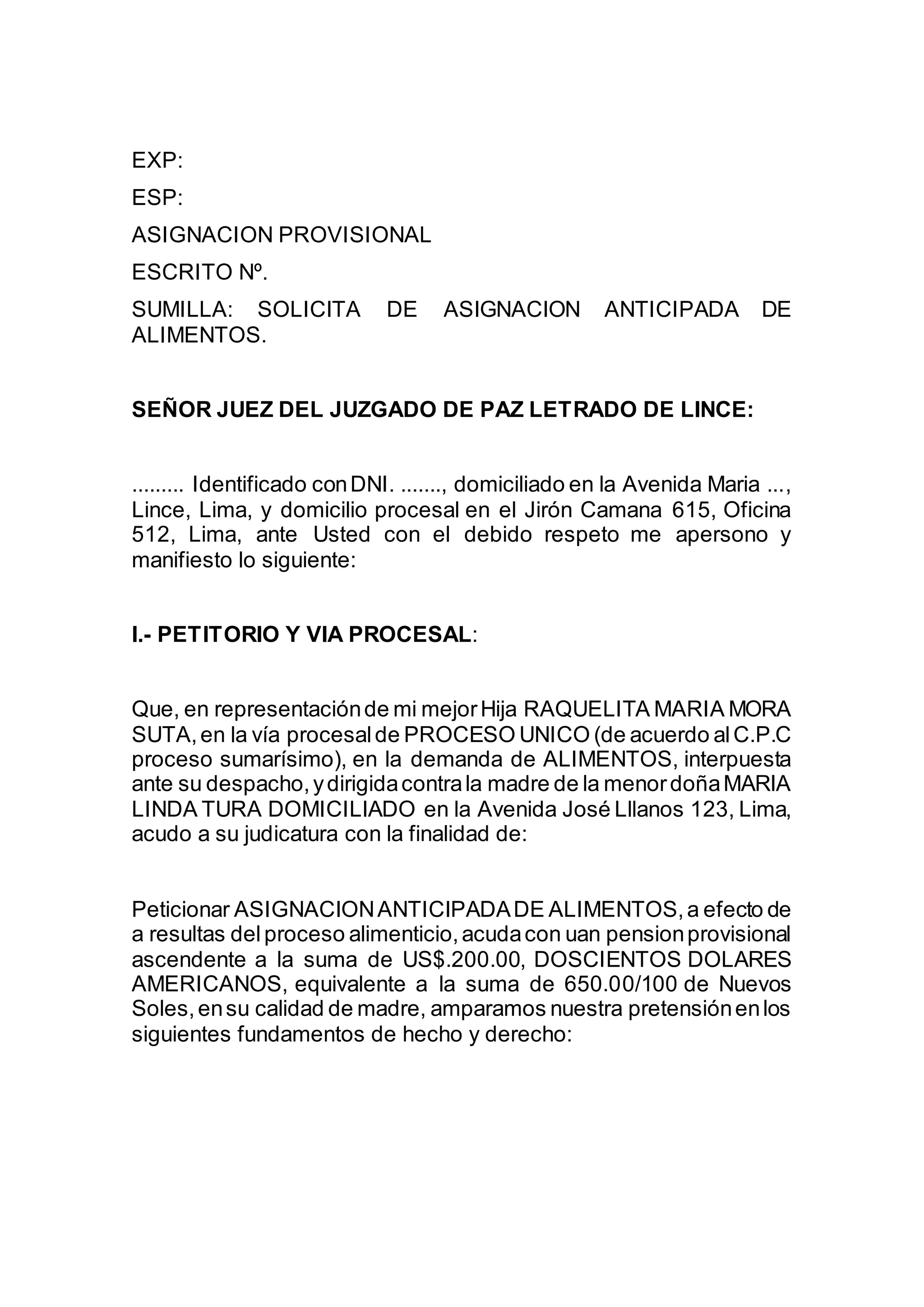 El solicitante pide una asignación provisional anticipada de alimentos para su hija menor de edad, María Foca Bonita. Argumenta que la madre de la niña, la demandada María Linda Tura, no le ha pasado pensión alimenticia y que la menor necesita apoyo para alimentación, vestimenta, salud, educación, vivienda y recreación. Solicita una asignación de US$200 o su equivalente en nuevos soles hasta que se resuelva el proceso de alimentos. Adjunta documentos que demuestran la demanda y su identidad como prueba.