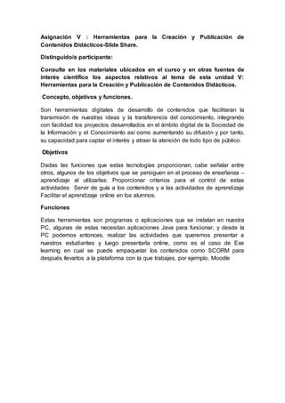 Este documento describe (1) herramientas digitales para crear y publicar contenidos educativos como SlideShare, (2) sus objetivos como guiar el aprendizaje en línea y facilitar la transmisión de conocimiento, y (3) ejemplos como EXe Learning y Ardora. También discute paquetes IMS y SCORM, y herramientas como EdiLimes, EXe Learning, y Lams.