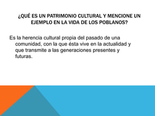 El documento define el patrimonio cultural y natural de Puebla, menciona ejemplos como la Laguna de Aljojuca y el Volcán Popocatepetl. También describe las comidas típicas como la tinga poblana y lugares como Cholula. Explica que Puebla fue fundada en 1531 por el Obispo Julián Garcés para establecer una ruta comercial entre la Ciudad de México y Veracruz. Los habitantes de Puebla se caracterizan por ser emprendedores y tener iniciativa. Algunas de sus tradiciones incluyen