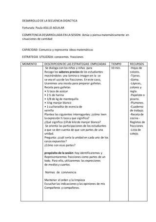 Este documento describe una sesión didáctica sobre fracciones. La sesión comienza con una actividad para recordar el significado de fracciones como parte de un todo, usando una receta de galletas como ejemplo. Luego, los estudiantes resuelven un problema sobre pasteles divididos en porciones iguales para practicar la representación de fracciones. Finalmente, los estudiantes completan ejercicios en sus cuadernos de trabajo para reforzar lo aprendido sobre la lectura y escritura de fracciones.
