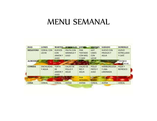 Este documento presenta un menú semanal que incluye las comidas y meriendas para cada día de la semana, comenzando con el desayuno, almuerzo, comida y merienda, e incluyendo opciones como cereal, huevos, fruta, pan tostado, enchiladas, caldo, pollo frito y pizza.