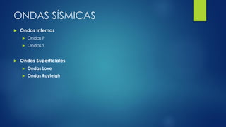 Este documento presenta información sobre ondas sísmicas, incluyendo las ondas P, S, Love y Rayleigh. Explica que las ondas P son longitudinales y las más rápidas, mientras que las ondas S son transversales y las que causan la mayoría de los daños. También cubre tipos de sismos, leyes de atenuación y usos de ondas sísmicas en exploración petrolera.