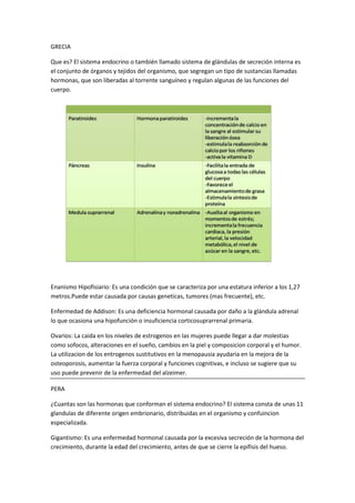 El documento describe varios conceptos relacionados con el sistema endocrino y hormonas. Explica que las hormonas son sustancias químicas secretadas por las glándulas endocrinas que actúan como mensajeros para regular funciones del cuerpo. Luego menciona varias enfermedades asociadas a desequilibrios hormonales como el hipertiroidismo, síndrome de Cushing, enanismo hipofisiario y hipotiroidismo.