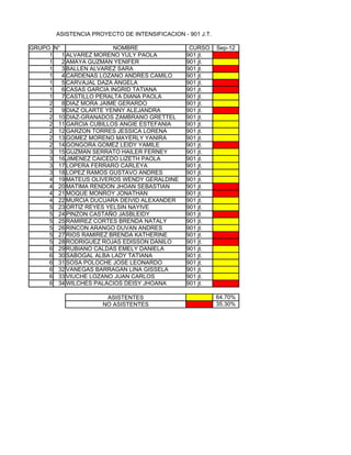 Este documento presenta listas de asistencia para tres proyectos de intensificación en diferentes cursos. Proporciona los nombres de los estudiantes de cada grupo y curso, así como los porcentajes de asistentes y no asistentes para cada proyecto.