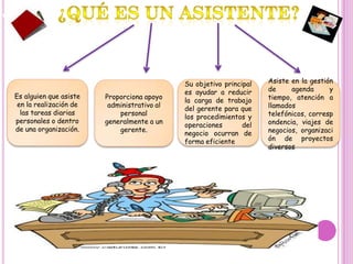 Un asistente ejecutivo proporciona apoyo administrativo a un gerente para ayudar a reducir su carga de trabajo. El asistente se encarga de tareas como la gestión de agenda, atención de llamadas telefónicas, correspondencia, organización de viajes y proyectos para que los procedimientos del negocio ocurran de forma eficiente.