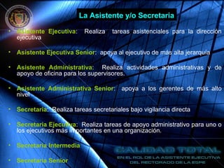 El documento describe las responsabilidades y cualidades de una asistente ejecutiva. Detalla las diferentes posiciones de asistente y secretaria, y las grandes áreas de actividad como la representación del jefe, comunicaciones, organización del trabajo y relaciones públicas. También enumera las cualidades intelectuales, morales, técnicas, sicológicas, sociales y físicas necesarias para el rol, incluyendo la discreción, memoria, empatía, trabajo en equipo e imagen personal.