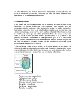 El documento presenta información sobre la teoría celular. Explica que la célula fue descubierta en 1646 y es la unidad básica de los seres vivos. Describe las características de las células procariotas y eucariotas, y los cinco reinos biológicos (monera, protista, fungi, plantae y animalia). También cubre temas como la hematología, tipos de células sanguíneas y los procedimientos para realizar frotis sanguíneos.