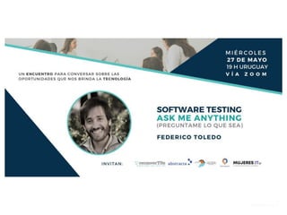 El documento consiste en una serie de preguntas y respuestas sobre el ámbito del testing de software en Uruguay, abordando temas como la experiencia laboral, formación necesaria, y la diferencia entre QA y QC. También se discuten las perspectivas del testing manual frente al automatizado, así como las posibles repercusiones en la industria IT debido a la situación mundial. Por último, incluye recomendaciones para quienes desean incursionar en el campo de la tecnología.
