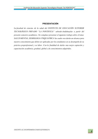 El documento aborda la salud mental y la semiología psiquiátrica, destacando su importancia para el bienestar general y el funcionamiento social de las personas. Se presenta una investigación que analiza las causas, clasificaciones y necesidades del cuidado de la salud mental, subrayando problemas como la depresión y la violencia de género. Se enfatiza en la necesidad de mejorar la atención y los programas de soporte para individuos con trastornos mentales en la comunidad.