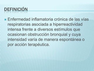 El documento proporciona información sobre el asma bronquial. Define el asma como una enfermedad inflamatoria crónica de las vías respiratorias asociada con hiperreactividad bronquial. Detalla la epidemiología, factores de riesgo como la atopia y el tabaquismo, manifestaciones clínicas como la tos y la disnea, y el diagnóstico a través de la historia clínica, auscultación y pruebas funcionales respiratorias.