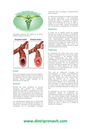 El asma es una enfermedad respiratoria crónica que afecta al 10% de la población mundial. Se caracteriza por episodios de dificultad para respirar causados por la inflamación y estrechamiento de los bronquios. Los síntomas incluyen tos, silbidos al respirar y sensación de falta de aire, y varían según la edad del paciente. El asma generalmente se desencadena por factores ambientales como el polen, ácaros del polvo o pelos de animales. Su tratamiento implica el uso de medicamentos antiinflam
