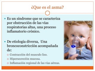 El asma es un síndrome caracterizado por la obstrucción de las vías respiratorias y un proceso inflamatorio crónico, influenciado por factores alérgicos, infecciosos y psicológicos. Se clasifica en asma intrínseca, extrínseca y bronquitis asmatiforme, presentando síntomas como disnea, sibilancias y tos. El tratamiento incluye broncodilatadores, esteroides y otros medicamentos para manejar la afección.