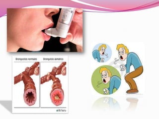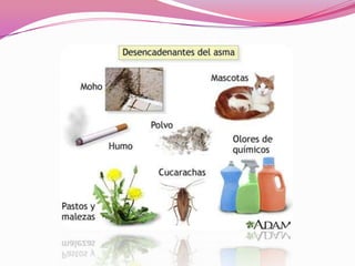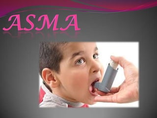 El asma es una enfermedad respiratoria crónica que afecta a los niños y jóvenes. Se caracteriza por la inflamación de los bronquios y la obstrucción variable y reversible de las vías respiratorias, causando síntomas como silbidos, falta de aire y tos. Puede ser desencadenada por alérgenos como el polen, ácaros del polvo o pelos de animales. Su diagnóstico se basa en la historia clínica y pruebas de función pulmonar, y su tratamiento incluye medicamentos antiinflam