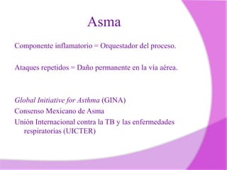 3) Presenta las definiciones de asma de organizaciones como GINA, UICTER y el Consenso Mexicano, las cuales enfatizan la naturaleza inflamatoria y la obstrucción variable del asma.