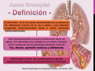 La enfermedad descrita se caracteriza por inflamación crónica de la vía aérea y una reacción exagerada a estímulos, lo que provoca obstrucción variable de la vía aérea y crisis de tos, disnea y sibilancias. Se trata de una enfermedad crónica con exacerbaciones agudas episódicas que varían en intensidad entre los individuos.