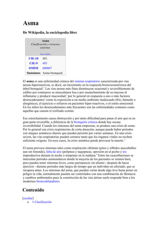 El documento describe el asma, una enfermedad crónica del sistema respiratorio caracterizada por vías aéreas hiperreactivas. El asma causa estrechamiento y obstrucción de las vías respiratorias en respuesta a factores desencadenantes como alérgenos, ejercicio o estrés. Esto provoca síntomas como falta de aire, tos y silbidos en el pecho. El asma puede controlarse mediante medicamentos y cambios ambientales, aunque en casos graves puede poner en peligro la vida si no se trata.