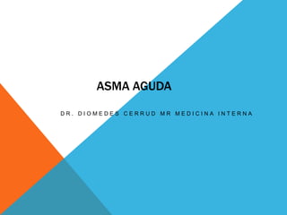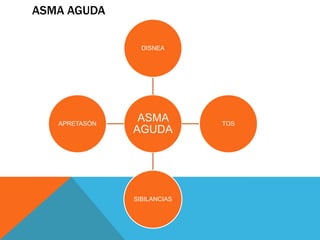Este documento describe el manejo del asma aguda. Detalla los signos y síntomas clínicos, la evaluación incluyendo pruebas de función pulmonar, y el tratamiento con broncodilatadores, oxígeno, glucocorticoides y otros medicamentos. También cubre los criterios para el alta hospitalaria o la continuidad del tratamiento.
