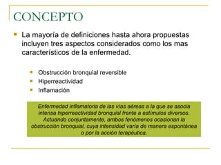 El documento describe el asma bronquial, definiéndolo como una enfermedad inflamatoria de las vías respiratorias que causa obstrucción reversible e hiperreactividad bronquial. Explica que afecta al 3-7% de la población y es más común en niños y mujeres jóvenes. Detalla las lesiones causadas, los mecanismos inflamatorios como la acción de eosinófilos y mastocitos, y los tratamientos como glucocorticoides y broncodilatadores.