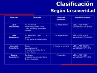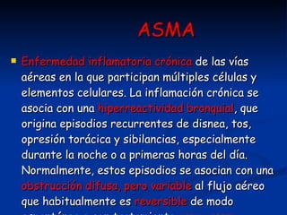 El documento trata sobre la definición y clasificación del asma. Define el asma como una enfermedad inflamatoria crónica de las vías respiratorias que se asocia con hiperreactividad bronquial y episodios recurrentes de tos, disnea y sibilancias, generalmente reversibles. Describe las pruebas objetivas para diagnosticar el asma como la espirometría, la variabilidad del flujo espiratorio máximo y las pruebas de provocación bronquial. Finalmente, resume las diferentes clasificaciones y el tratamiento farmacológico estr