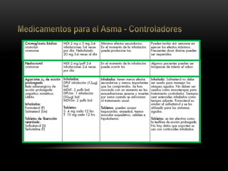 Este documento describe el asma, incluyendo sus características, factores de riesgo, manifestaciones clínicas, y tratamiento. El asma es una enfermedad crónica caracterizada por la obstrucción variable e inflamación de las vías respiratorias, que a menudo es reversible. Los factores desencadenantes más comunes incluyen alérgenos, infecciones virales, humo, ejercicio y estrés. El diagnóstico se basa en la historia clínica y pruebas pulmonares. El tratamiento se enfoca en reducir la infl