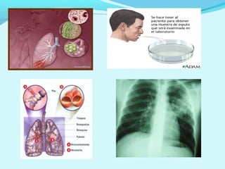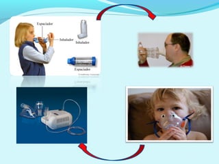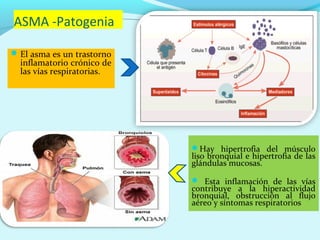 El documento describe el asma, una enfermedad inflamatoria crónica de las vías respiratorias. Explica que hay hipertrofia del músculo liso bronquial e hipertrofia de las glándulas mucosas, lo que contribuye a la hiperactividad bronquial, obstrucción al flujo aéreo y síntomas respiratorios. Detalla los síntomas como tos y sibilancias, y los exámenes como espirometría y radiografía de tórax para el diagnóstico. Finalmente, explica los