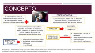 El documento resume los conceptos clave del asma, incluyendo su definición como un trastorno inflamatorio crónico de las vías respiratorias bajas que causa episodios recurrentes de sibilancias e hiperreactividad bronquial. Explica la epidemiología, etiología multifactorial, factores desencadenantes, fisiopatología, fenotipos clínicos, diagnóstico, tratamiento y clasificación del asma según gravedad y control de síntomas.