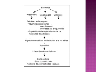 El documento habla sobre el asma y la tuberculosis en niños. El asma es una enfermedad inflamatoria crónica de las vías respiratorias causada por factores congénitos, hereditarios y ambientales. Los síntomas incluyen silbidos, tos y dificultad para respirar. El tratamiento se basa en medicamentos y control de factores desencadenantes. La tuberculosis es una infección pulmonar causada por una bacteria que se transmite por el aire, afectando principalmente a niños con baja inmunidad. Los síntomas pueden ser variables e in