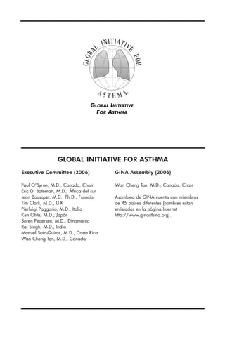 Este documento presenta una guía de bolsillo para el manejo y prevención del asma en niños. Brinda información sobre el diagnóstico, clasificación y tratamiento del asma en niños, con énfasis en desarrollar una relación médico-paciente, identificar y reducir factores de riesgo, y abordar el tratamiento y monitoreo del asma de manera escalonada según el nivel de control. También cubre el manejo de exacerbaciones y consideraciones especiales en el tratamiento del asma pediátrica. El objetivo es proveer