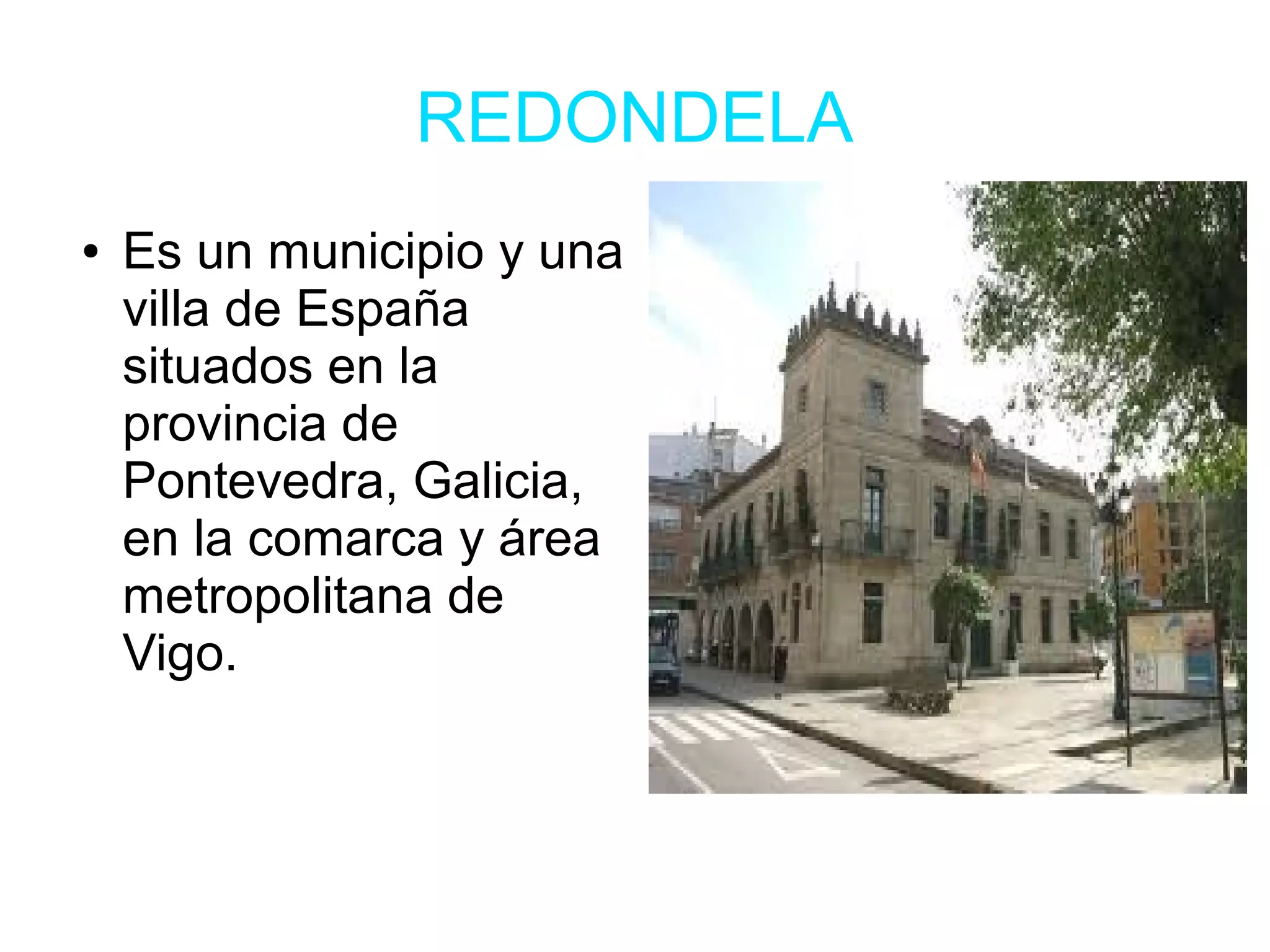 Redondela es un municipio español en Galicia donde se celebran varias fiestas populares. La Fiesta de los Mayos celebra la llegada de la primavera el 1 de mayo. El Festival de los Títeres llena las calles y plazas con títeres y diversión. Durante el Corpus Christi se representa la leyenda de la Coca con danzas y bailes. Las Festas do Carme honran a la Virgen del Carmen, patrona de los marineros, con misas y conciertos por la noche.