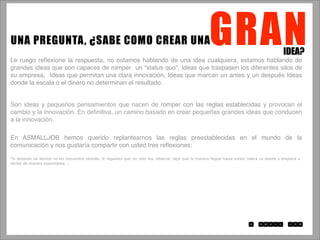 Este documento presenta tres reflexiones sobre cómo crear grandes ideas innovadoras que rompan con las reglas establecidas. Primero, afirma que la notoriedad ya no es importante y que las ideas deben pasar desapercibidas inicialmente. Segundo, dice que la repetición no genera emoción, sino que se necesitan ideas nuevas e inesperadas. Tercero, señala que los adultos deben recuperar la inocencia y el espíritu lúdico de la infancia para generar ideas creativas. El objetivo es provocar el cambio a través de peque
