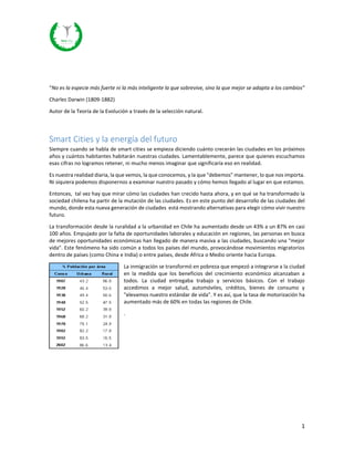 El documento discute los desafíos que enfrentan las ciudades en crecimiento con respecto al suministro de energía. Señala que las ciudades consumen una gran parte de la energía global y emiten la mayoría de los gases de efecto invernadero. A medida que las ciudades continúan creciendo y cambiando, será necesario encontrar formas más limpias y sostenibles de satisfacer la creciente demanda de energía de manera resiliente ante los impactos del cambio climático. Se propone fomentar la innovación en energías renovables,