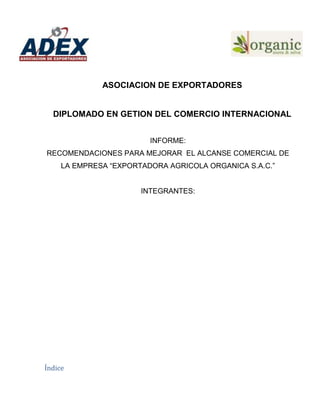 El documento proporciona recomendaciones para mejorar el alcance comercial de la empresa peruana Exportadora Agrícola Orgánica S.A.C., incluyendo identificar a Estados Unidos como mercado objetivo, seleccionar importadores potenciales como Vasinee Food Corp en Nueva York, y desarrollar una campaña de correo electrónico para promover los granos andinos.