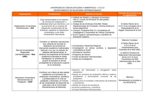 El documento describe las organizaciones internacionales e interinstitucionales de las que forma parte la Universidad Distrital Francisco José de Caldas. Entre ellas se encuentran AUALCPI, UDUAL, IAUP, OUI, Red UREL, AUIP, Universia, TUFH, ARIUSA y RCIL, cuyos objetivos incluyen la cooperación académica, la movilidad estudiantil, la investigación conjunta y el fortalecimiento de la educación superior en América Latina, el Caribe y otras regiones. La UDCA ocupa posiciones de lider