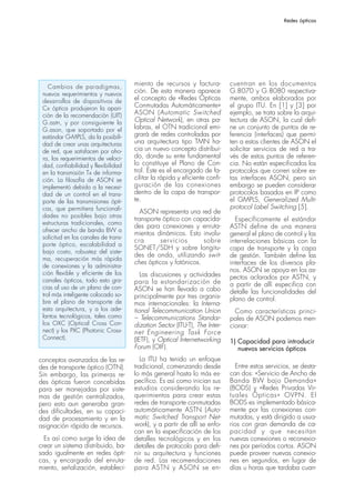 Este documento describe la funcionalidad de las redes ópticas conmutadas automáticamente (ASON). ASON permite la introducción dinámica de nuevos servicios ópticos como ancho de banda bajo demanda y redes privadas virtuales ópticas. ASON también proporciona enrutamiento y restauración de servicios más eficientes mediante el uso de un plano de control inteligente sobre la capa de transporte.