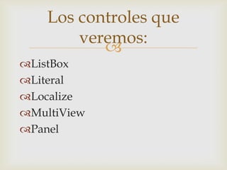 El documento describe diferentes controles ASP.NET como ListBox, Literal, Localize, MultiView y Panel. ListBox permite selección múltiple de elementos de una lista. Literal y Localize muestran texto estático pero Literal no permite estilos y Localize se usa para texto que puede traducirse. MultiView actúa como contenedor para grupos de controles View y muestra un View según criterios. Panel provee un contenedor para agrupar y ocultar/mostrar controles.