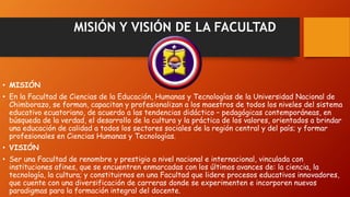 La Universidad Nacional de Chimborazo tiene como misión formar profesionales críticos comprometidos con los valores humanísticos que contribuyan al desarrollo sostenible de la provincia y el país. Su visión es ser una institución líder en educación superior que forme profesionales responsables socialmente con conocimientos científicos para impulsar el desarrollo sostenible de la sociedad.