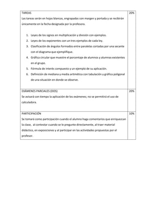 Este documento describe los aspectos que serán evaluados en la clase de matemáticas durante el período del 18 de agosto al 17 de octubre de 2014. Los estudiantes serán evaluados en su cuaderno de apuntes (20%), libro de texto (10%), tareas (10%), exámenes parciales (20%), examen departamental (20%) y participación (10%). Se proporcionan detalles sobre los requisitos para cada categoría evaluada.