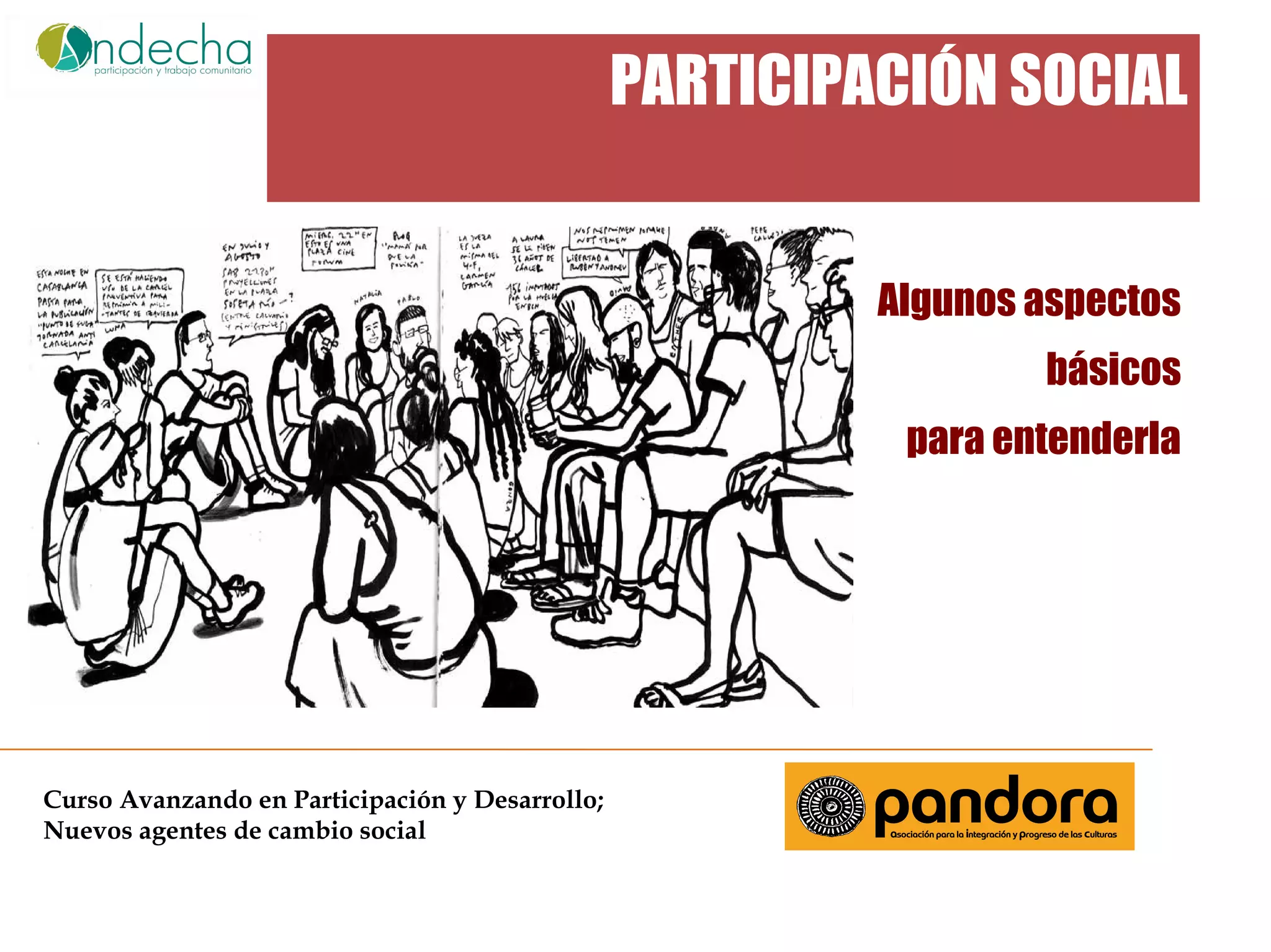 El documento aborda la importancia de la participación social como un proceso colectivo que requiere aprendizaje y práctica en grupo. Destaca elementos como la comunicación, la escucha activa y metodologías participativas que facilitan esta involucración. Además, menciona la 'escalera de Hardt' como una herramienta teórica para entender los diferentes tipos de participación en la sociedad.