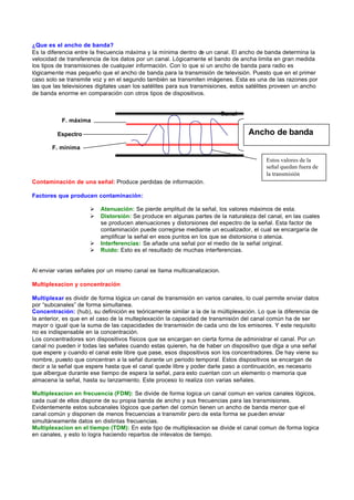 Este documento describe varios conceptos clave relacionados con la transmisión de señales a través de redes. Explica conceptos matemáticos como la suma de señales, señales sinusoidales y señales periódicas. También describe factores físicos como la ley de Ohm, la atenuación medida en decibelios, y tipos de medios de transmisión como cables, fibra óptica y sistemas inalámbricos. Por último, explica técnicas como la multiplexación, modulación y factores que contaminan las
