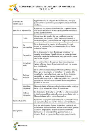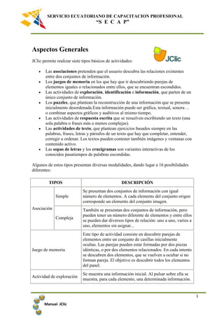 JClic permite realizar siete tipos básicos de actividades como asociaciones, juegos de memoria, actividades de exploración e identificación, puzzles, actividades de respuesta escrita y de texto como crucigramas y sopas de letras. Estas actividades pueden presentarse de diversas modalidades dando lugar a 16 posibilidades diferentes. El programa JClic y su autor JClic permiten crear, ver y ejecutar actividades de forma sencilla con diversas herramientas y opciones.